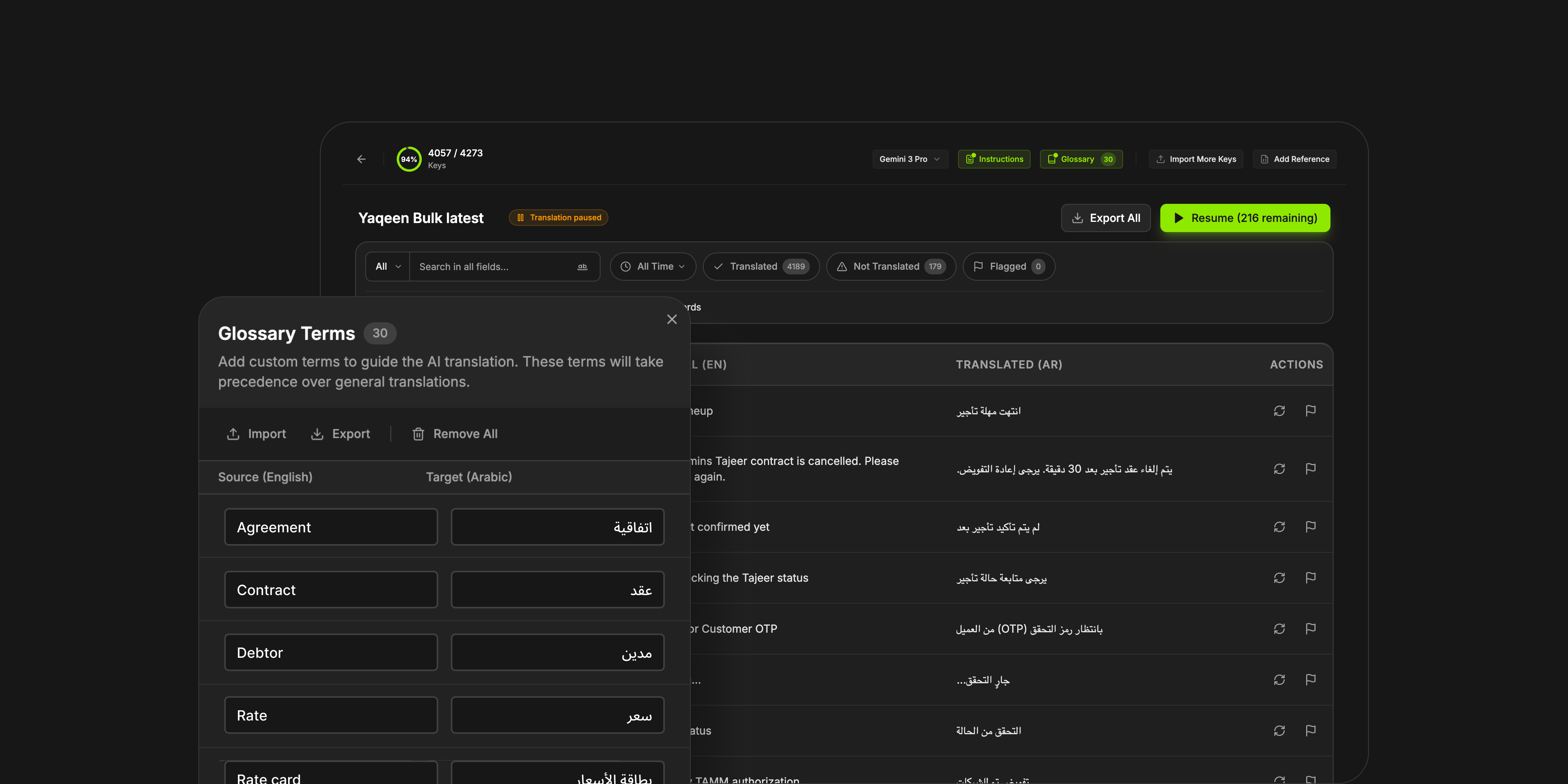 At the heart of Arabizer is a context-aware glossary that ensures consistent terminology across the entire product.